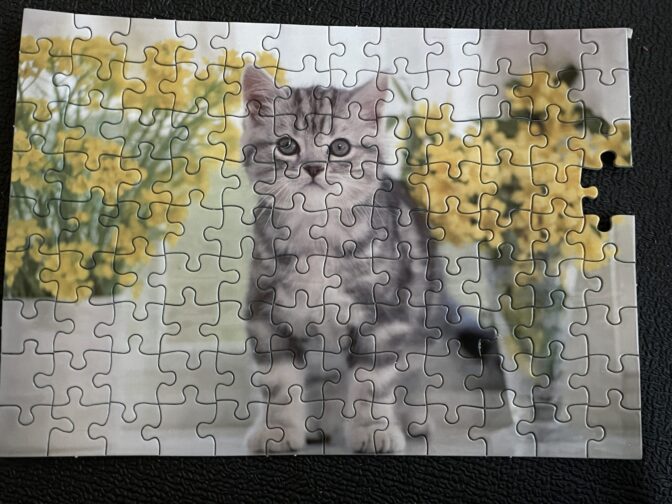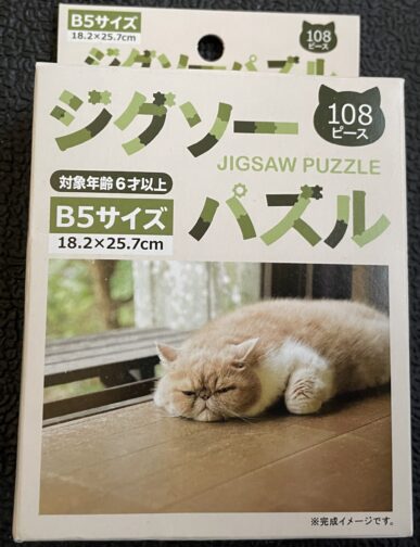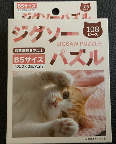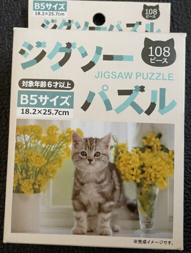108ピース猫シリーズ 2024年末にリニューアルして発売されたダイソーのパズルシリーズ108ピースだから小学生でも楽しんで取り組めるカンジかな?「その2」はセリアで購入した気がするのでどちらでも購入可能なのかもしれません ジグソーパズル 108ピース 猫柄(その1) 完成品 ジグソーパズル 108ピース 猫柄(その2) 完成品 ジグソーパズル 108ピース 猫柄(その3) 完成品 「その3」完成品1ピース外れた状態でしたねここで初めてミスに気付いた雑な性格の私…