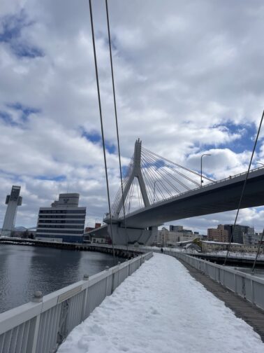 青森ラブリッジの歩道を雪を踏みしめつつ